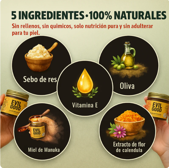 Solo contiene cinco ingredientes naturales: sebo de res alimentado con pasto, miel de manuka, aceite de oliva ecológico prensado en frío, extracto de flor de caléndula y vitamina E ecológica.